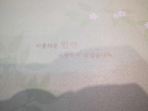 [幸福日光]所提供的婚卡樣式很多款(傳統的中式也有);而我喜歡的剛好都是必須從韓國下訂過來的;從下訂到印製的過程大概需要兩周;所以我會建議如果早已知道婚期的準新娘們別把自己搞得像我這般緊張;因為誰叫我一直到最後一刻才找到喜歡的款嘛!這張也很美吧!但庫存不多只有35張不夠我用啊!