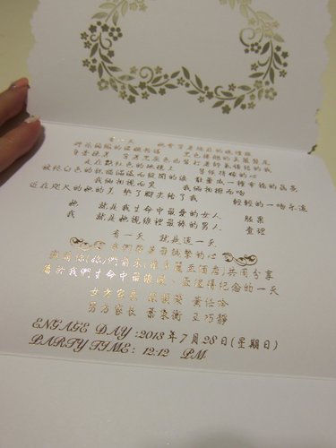 都決定好印製張數就是內文的內容+燙金字體色(有的廠商加印燙金也要加收);因為我不想走傳統的古板文字;我覺得那樣的婚卡內容是無法感動到人心的;很冰冷;所以特地請我家的文青彈寶先生;寫了一段對於我們都很有意義的內文
